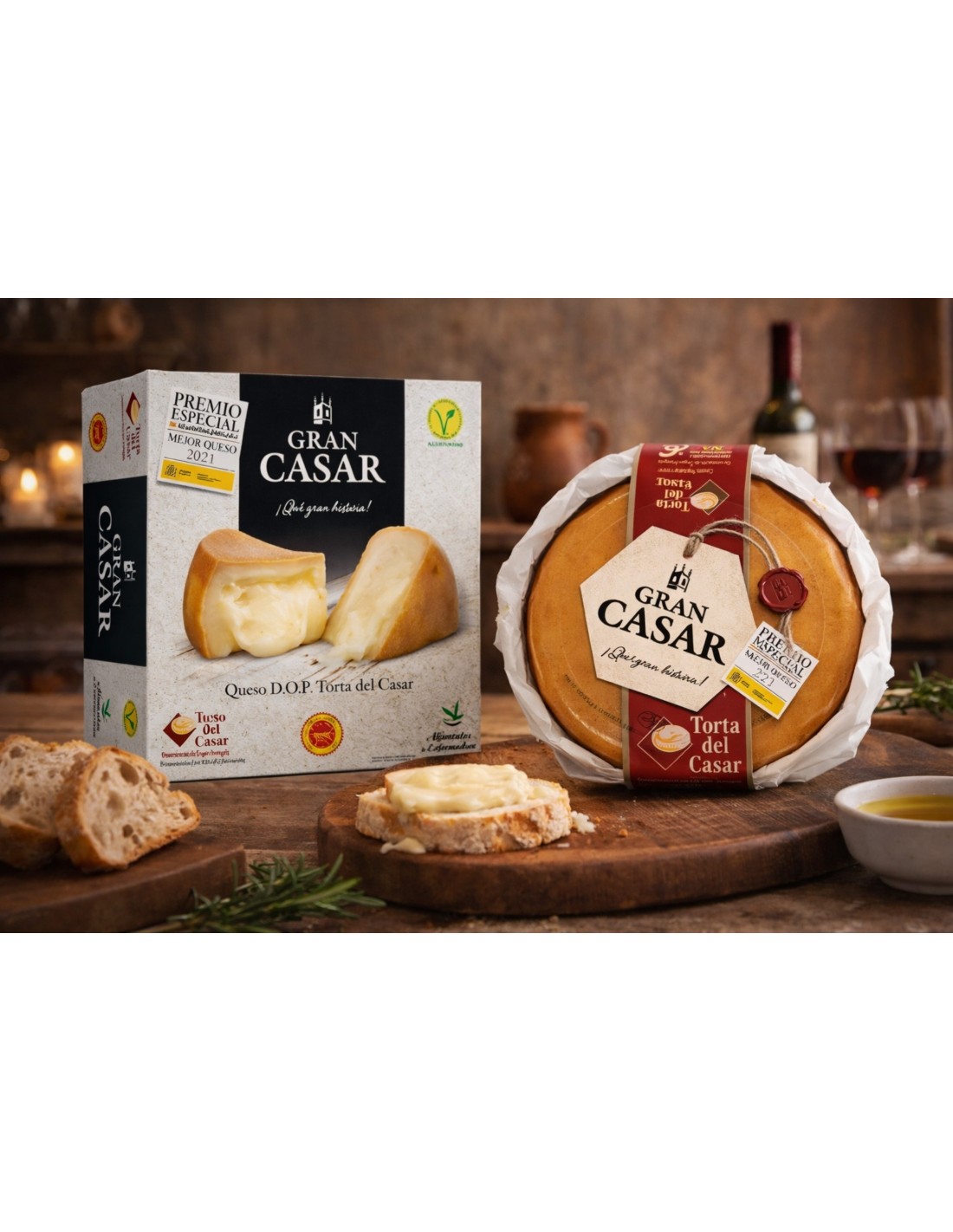 Gran Casar es una auténtica Torta del Casar con Denominación de Origen Protegida, elaborada con leche cruda de oveja y cuajo vegetal natural. Se caracteriza por su textura cremosa y fundente, ideal para abrir y disfrutar directamente con cuchara o untar sobre pan rústico.